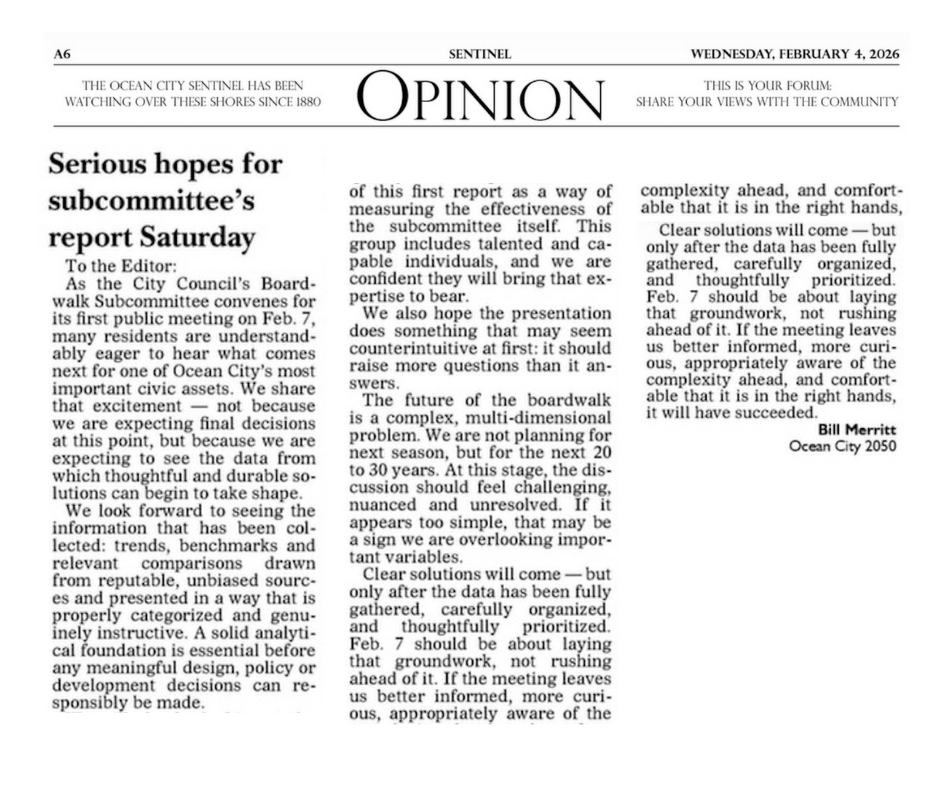 As the City Council’s Boardwalk Subcommittee convenes for its first public meeting on Feb. 7, many residents are understandably eager to hear what comes next for our Ocean City’s most important civic asset. We share that excitement—not because we are expecting final decisions at this point, but because we are expecting to see the data flow, which thoughtful and durable solutions can begin to take shape.